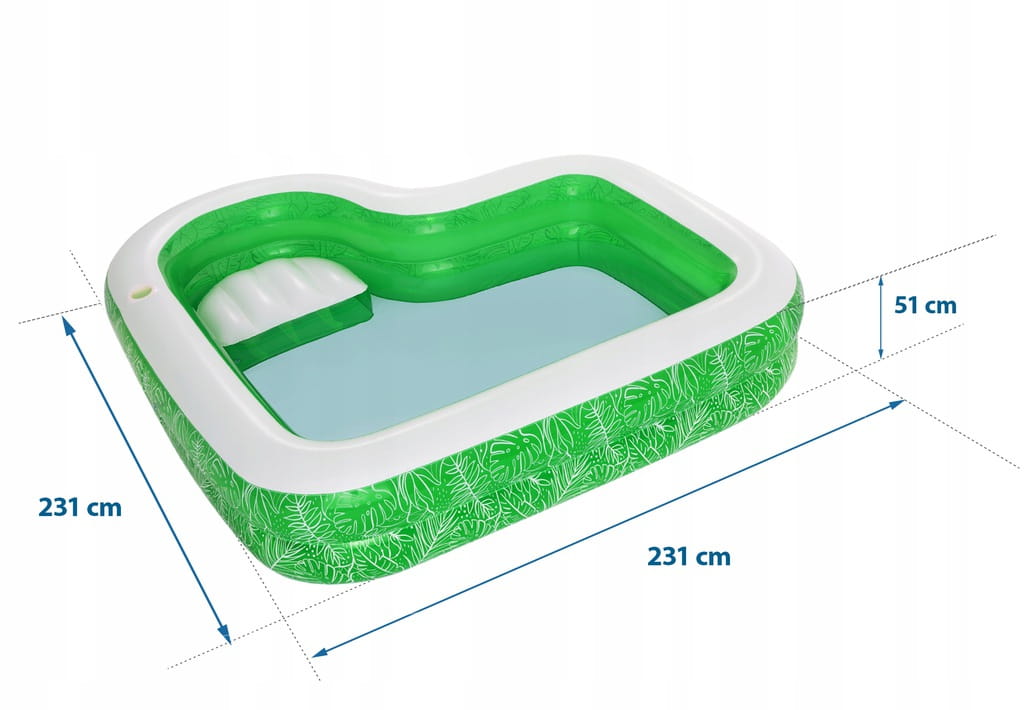 Doświadcz chłodnego orzeźwienia w upalne dni, z gwarancją dobrej zabawy dla całej rodziny. Basen po nadmuchaniu mierzy 2,31 m długości i jest wykonany z wytrzymałego materiału PVC. Usiądź wygodnie i zrelaksuj się na wbudowanej dmuchanej poduszce do siedzenia, podczas gdy dzieci pluskają się w słońcu.