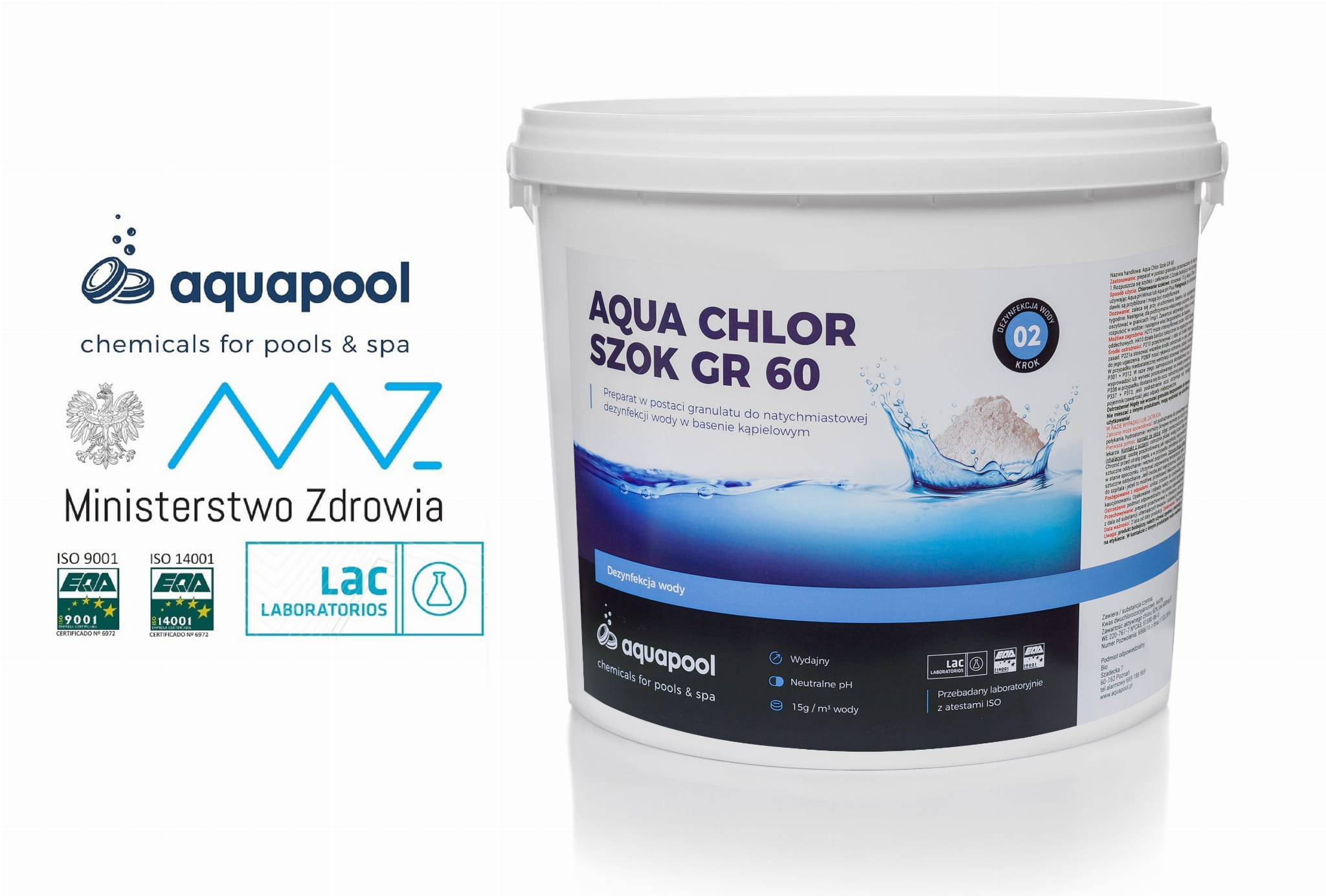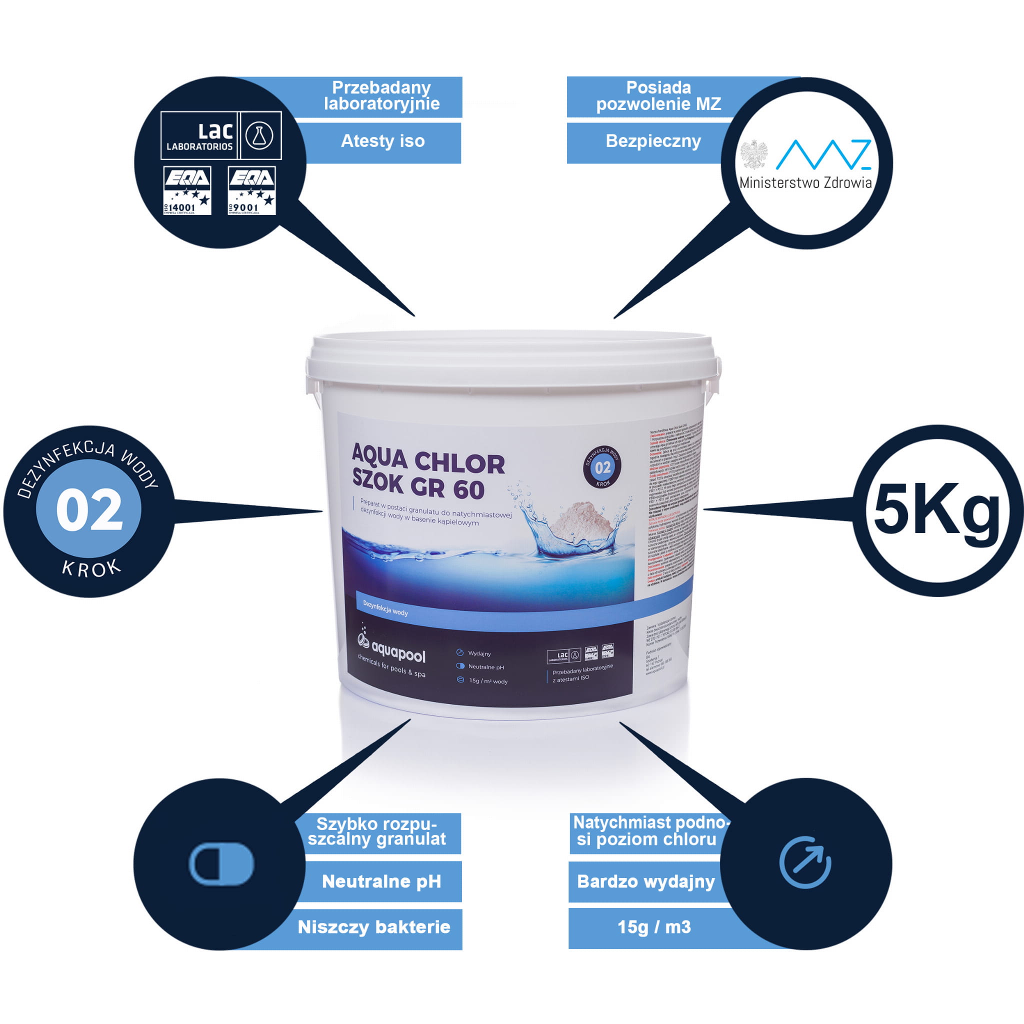 Chlor szok do basenu - środek ten działa natychmiastowo przeciwko bakteriom, glonom oraz posiada neutralne pH chloru. Chlor szok stosujemy przede wszystkim gdy woda w basenie jest świeża oraz gdy basen wymaga natychmiastowej dezynfekcji, np woda stała się mętna, zielona lub poziom chloru wolnego w wodzie gwałtownie spadł.