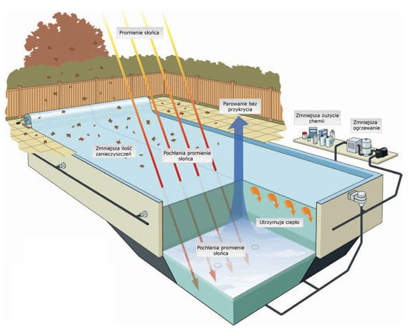 - Płachta solarna zmniejsza odparowywanie wody z basenu.
