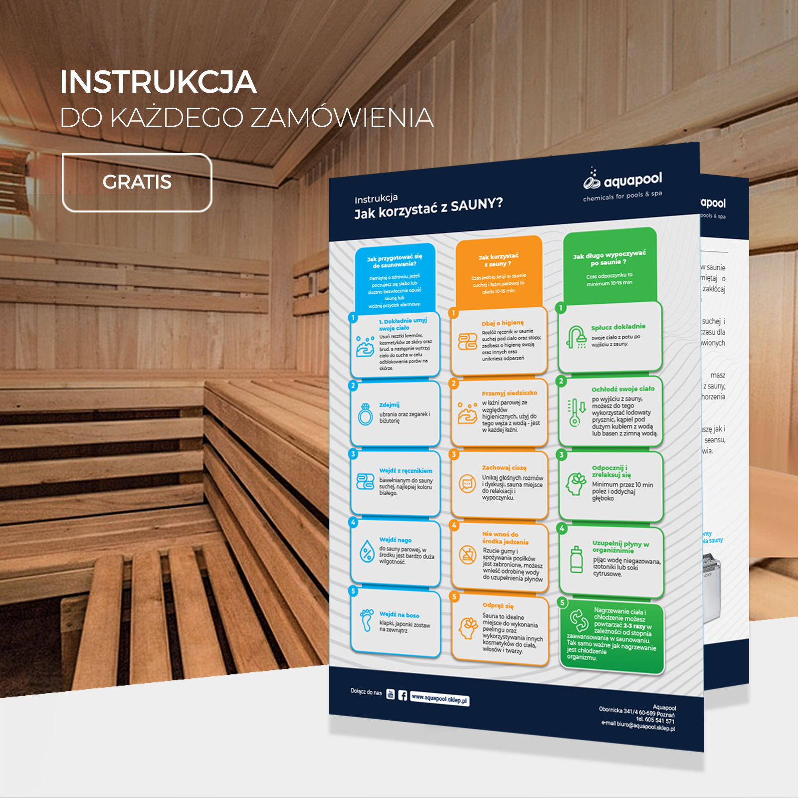 Koncentrat zapachowy do sauny suchej należy rozcieńczyć w wodzie w proporcji 35 - 45 ml płynu na 1 litr wody. Po wykonaniu tej czynności należy schłodzić mocno kamienie czystą wodą z cebra i następnie polewać przygotowaną mieszanką emulsji zapachowej z wodą schłodzone wcześniej kamienie do uzyskania odpowiedniej mocy aromatu w saunie. Olejki do sauny są stworzone na bazie naturalnych olejków eterycznych. Koncentraty zapachowe do sauny marki Aquapool idealnie nadają się do aromaterapii w trakcie seansu w saunie i są niezwykle skuteczne gdyż wchłanianie olejków do sauny odbywa się zarówno przez drogi oddechowe jak i przez skórę. Nasza gama 20 zapachów jest idealna do tworzenia rytuałów zapachowych gdyż można je stosować na przemian ponieważ nie pozostawiają po sobie żadnych zanieczyszczeń i osadów na kamieniach