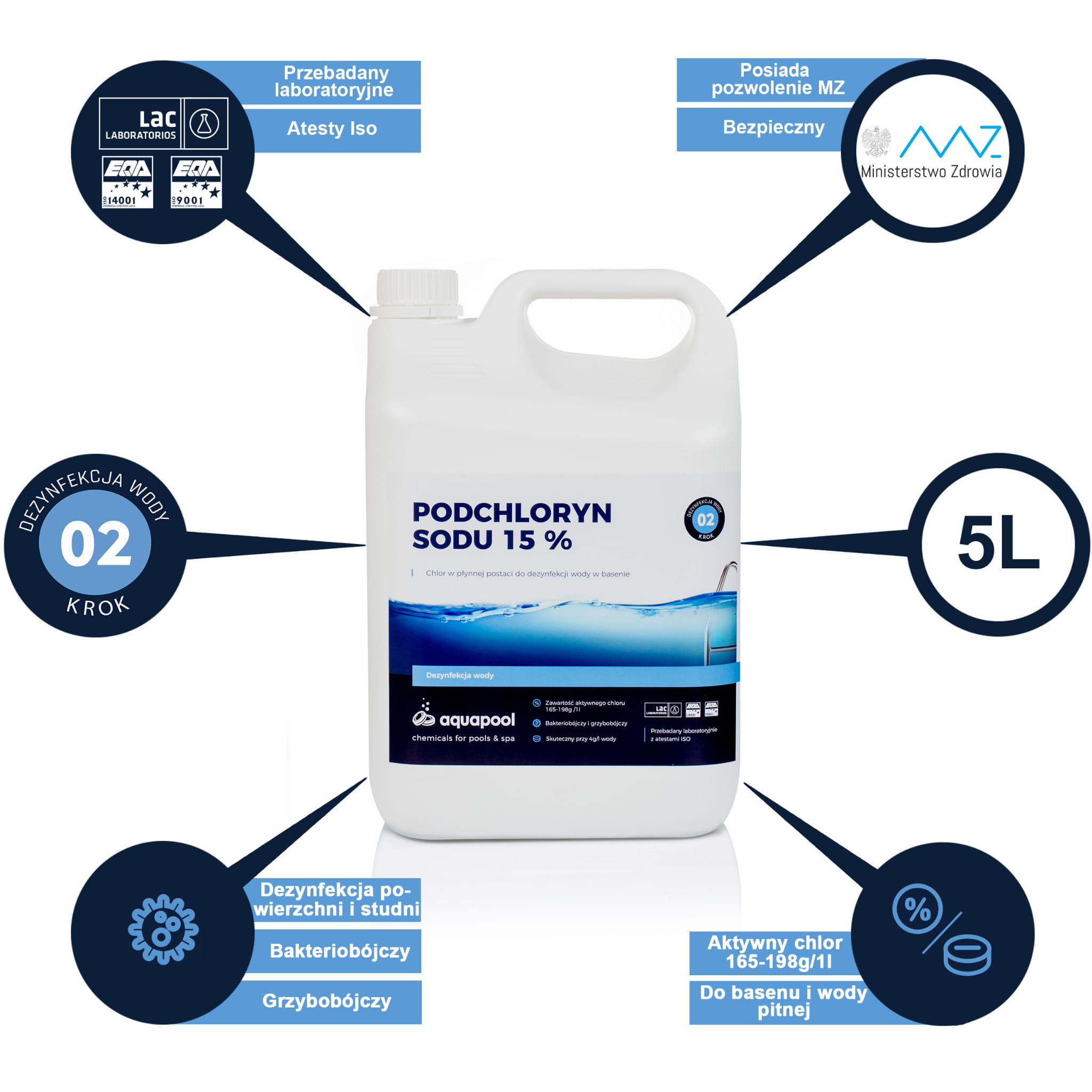 Dzięki zawartości atomów chloru, podchloryn sodu ma zdolność do skutecznego niszczenia substancji organicznych znajdujących się w wodzie basenowej. W krótkim czasie zabija bakterie i wirusy, co w efekcie sprawia, że woda znajdująca się w basenie jest bezpieczna dla wszystkich kąpiących się w nim osób.