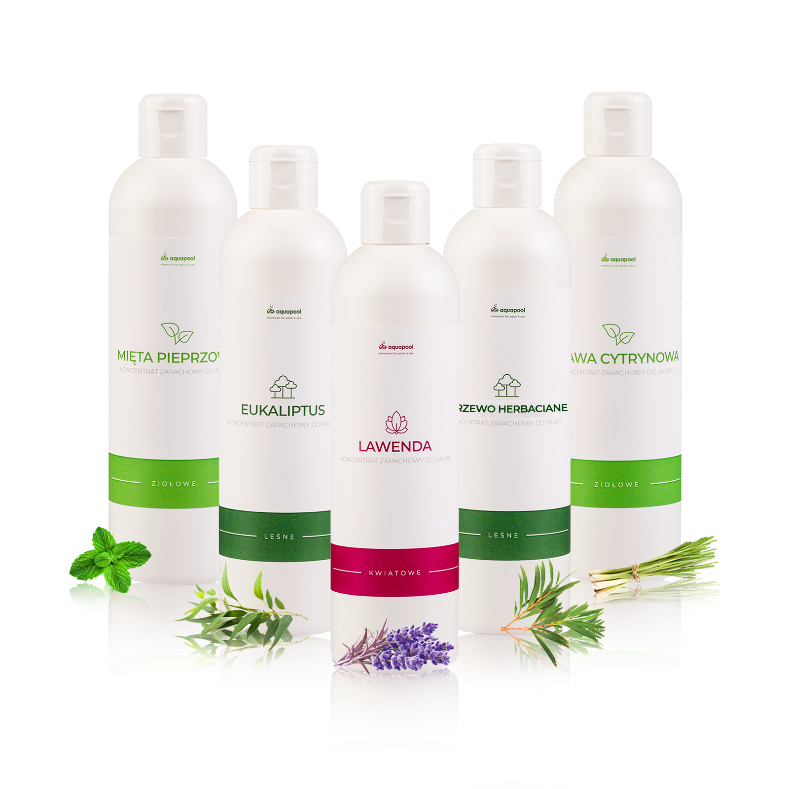 Zestaw 5 emulsji eterycznych do sauny o zapachach: eukaliptusa, lawendy, mięty pieprzowej, trawy cytrynowej i drzewa herbacianego.